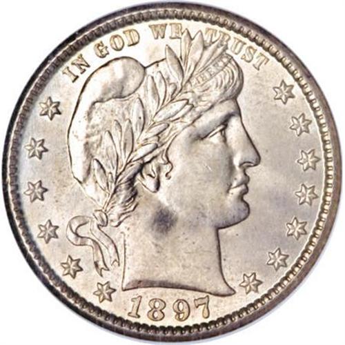 <B>1897-O 25C MS65 NGC.</B></I> Among the rarest Barber quarters in Mint State, given an R.6 rating by the Feigenbaums. The obverse is tinged silver-pink, while the reverse is largely untoned silver-white. Perusal with a loupe reveals a bold strike for this O-mint coin, with a few freckles of steel-gray patina on the obverse. A couple of ticks on Liberty's cheek appear to be the grade-limiting factor, but the appeal is right. Census: 6 in 65, 7 finer (1/08).<BR><I>From The Southwest Collection.</B></I><BR><BR><B>Coin Engraver:</B> Charles E. Barber<BR><BR><b>Shipping:</b> Coins & Currency (<a target="_blank" href="http://www.heritageauctions.com/common/shipping.php">view shipping information</a>)