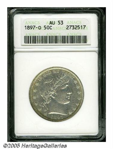 <B>1897-O<50C> AU53 ANACS.</B></I> A pleasing satiny sheen appears over the lightly worn, mildly marked surfaces. Numerous wispy hairlines are evident on the obverse, but not on the reverse. The 1897-O is a highly respected issue in the series whose mintage of 632,000 pieces is indicative of its rarity, especially in higher grades.<BR><I>From The Empire State Collection, Part Two.</B></I>