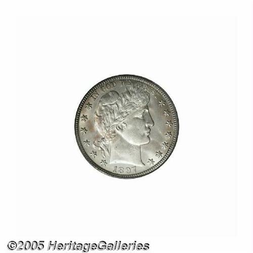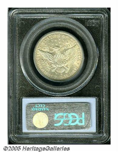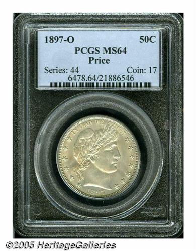 <B>1897-O<50C> MS64 PCGS.</B></I> Ex: Price Collection. This is a sharply struck and lightly toned near-Gem with subliminal champagne toning. The surfaces have a few tiny abrasions, but the overall eye appeal out-distances many Gem quality Barber Half Dollars. Not only is this a lovely example for the grade, but it is an elusive date as well. Few finer examples have been certified by PCGS. Population: 15 in 64, 14 finer (6/05).