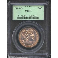 1897-O 50C MS64 PCGS. One of the lower mintage issues in the Barber Half Dollar series, the 1897-O was produced to the extent of just 632,000 coins. The vast majority of survivors are well worn, with Poor, Fair, AG, and Good being the most prevalent grades. An understandably important near-Gem, this coin displays a softly frosted sheen with light, mottled, champagne-gray overtones. The reverse impression is a little soft in areas, as one might expect for an O-mint Barber coin, but the surfaces do not reveal any abrasions that would seem to rule out an MS65 grade. A significant find for the advanced Barber Half Dollar specialist, and worthy of a premium quality bid. Population: 11 in 64, 13 finer (7/02).From the Ohio Collection. Important notice: We expect to be auctioning lots at the rate of 200-250 per hour. Sometimes eBay Premier live bid software cannot keep up with that pace, so we strongly recommend that you place a realistic proxy bid now as insurance to avoid disappointment. Also please note that all Heritage/CAA lots purchased through eBay Premier carry a 20% Buyer's Premium. Please make sure you read the Terms and Conditions.