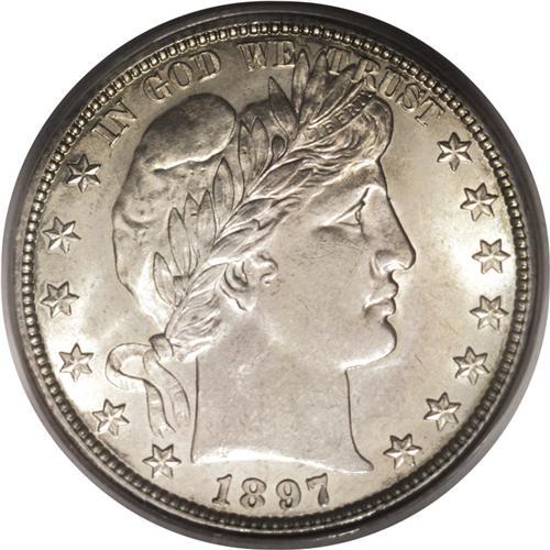 <B>1897-O<50C> MS64 PCGS.</B></I> Only 632,000 pieces were struck of the 1897-O, and apparently most of the mintage slipped into circulation and stayed there. This is an attractive near-Gem example that is uncommonly well struck for the issue. The mint luster is pronounced with a softly frosted appearance, and each side is overlaid by subtle shadings of golden and lilac. Population: 17 in 64, 15 finer (8/06).