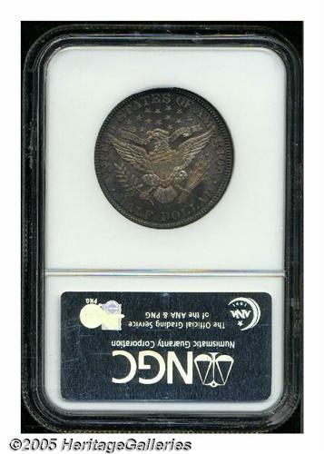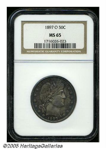 <B>1897-O<50C> MS65 NGC.</B></I> Although not in the same league as the Andre Dawson specimen being offered in our Platinum session (a shameless, sports related pun), this deeply toned Gem is among the nicer 1897-O Half Dollar extant. Both sides are very well struck beneath layers of violet and antique-golden toning that intensify to flashes of emerald-green iridescence at the margins. Population: 7 in 65, 4 finer (6/05).