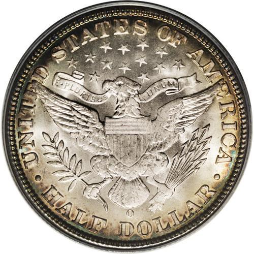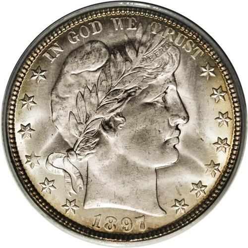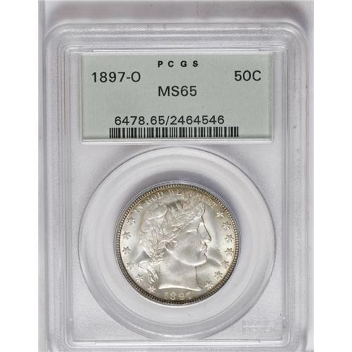 <B>1897-O<50C> MS65 PCGS.</B></I> The 1897-O is a challenging coin in grades from Fine upward. Gems are naturally very rare, and in fact, only eight other pieces have been so graded by PCGS with six finer (8/06). This is an absolutely splendid Barber half. The mint luster, which is the life of any coin, is thick and frosted. The appearance of this coin is much closer to that of an S-mint than the typical New Orleans' product. The obverse is sharply defined, but the reverse displays the usual softness typical of this and other O-mint halves. Generally brilliant, there is just the slightest accent of golden toning around the margins. An exceptionally attractive example of this semi-key Barber half.