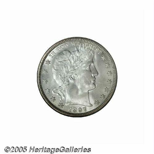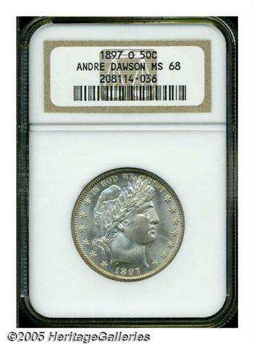 <B>1897-O<50C> MS68 NGC.</B></I> Ex: Andre Dawson. When we cataloged this coin seven years ago we declared it to be the finest known of the issue. We also noted in the description at that time that another MS68 had been certified (by PCGS) and speculated that this was likely the same coin. We now know that is not true as the Goldbergs sold the PCGS coin in 2002 (for $25,300). Nevertheless, being tied for finest known is still quite an honor for a coin such as an 1897-O Half. In fact, both of the branch mint 1897 issues represent a significant challenge for the date collector in AU and higher grades. Only 632,000 pieces were struck of this issue, at a time when average production was over two million pieces for half dollars. So, when average production was that low for a high mintage issue in the Half Dollar series, it tends to make up for the lack of standout rarities as in the Dime and Quarter series with the 1894-S and 1901-S respectively. Only a few dozen Uncirculated examples of the 1897-O are known to survive and very few are known in Gem condition.<BR> This amazing specimen gives the appearance of a newly minted coin, being virtually untoned and incredibly frosty with hardly a blemish to be found. Only under close scrutiny can a few well scattered, microscopic frost breaks be seen on the obverse. The strike is fully executed in all areas and the vibrancy of the luster is perhaps its greatest attribute.