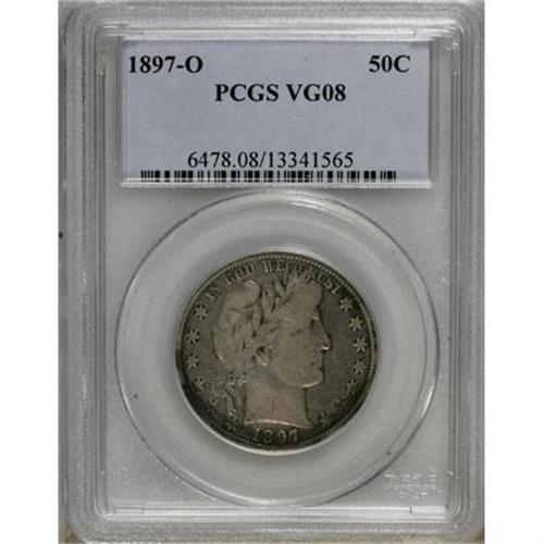 <B>1897-O 50C VG8 PCGS.</B></I> PCGS Population (15/114). NGC Census: (14/66). Mintage: 632,000. Numismedia Wsl. Price for NGC/PCGS coin in VG8 : $200. (#6478)<BR><BR><B>Coin Engraver:</B> Charles E. Barber<BR><BR><b>Shipping:</b> Coins & Currency (<a target="_blank" href="http://www.heritageauctions.com/common/shipping.php">view shipping information</a>)