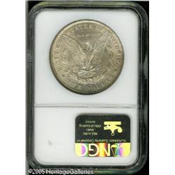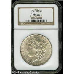 <B>1897-O<img border='0' src='http://www.heritagecoins.com/images/star.gif' width=10 height=10>$1 MS60 NGC.</B></I> Although boldly struck for a '97-O, the satiny luster has the normal subdued appearance beneath streaks and splashes of apricot toning on each side. Lot:10506