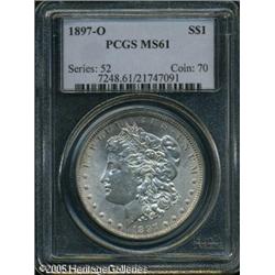 <B>1897-O<img border='0' src='http://www.heritagecoins.com/images/star.gif' width=10 height=10>$1 MS61 PCGS.</B></I> White and typically marked over the surfaces with white centers and faint champagne color around the rims. A difficult and desirable issue in any Mint State grade. Lot:10508