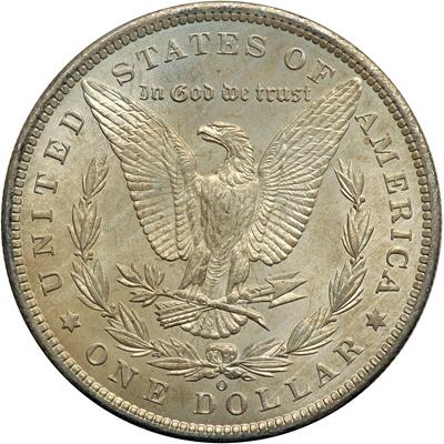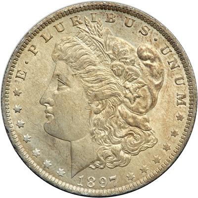 1897-O Morgan Dollar. Sharpness of MS-63. The surfaces are remarkably free from marks, however, the uniform golden toning is suspect.