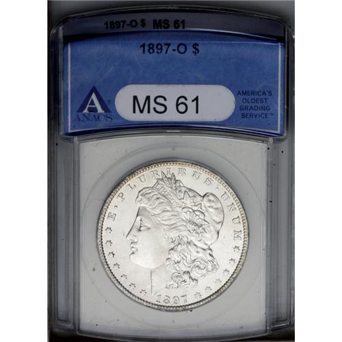 <B>1897-O<img border='0' src='http://www.heritagecoins.com/images/star.gif' width=10 height=10>$1> MS61 ANACS.</B></I> This piece has an uncommonly bold strike, with especially strong details over the ear of Liberty. There are a number small abrasions on the coin to account for the grade, and a light bit of champagne patina is noted over the hard, satiny luster. <BR><BR><B>Important notice:</B> Heritage usually auctions material at the rate of 200-250 lots per hour. On some occasions eBay Live bid software or the Internet may not be able to keep up with the pace of the auction. We recommend placing a realistic absentee bid now as insurance to avoid disappointment. Occasionally the auctioneer may eliminate or reject an eBay Live bid, and the auctioneer may also reopen a lot after the close of the eBay live bidding (usually because we missed an audience bid), and may reject your bid even if it shows you as the winning bidder. By bidding via eBay Live, you agree that Heritage may award the lot to another bidder at its sole discretion under the circumstances described above or any other reasonable circumstances. Since eBay bids are not shown to us until we open the lot on the floor, we treat those bids just like floor bids. In most cases the floor responds before the eBay bid is presented to us, due to Internet lag time, so for consistency we have made it a policy that floor bids are always considered first over tie eBay live bids. Also please note that all Heritage lots purchased through eBay Live carry a 20% Buyer's Premium. Please make sure you read the Terms and Conditions before you bid. This lot is being auctioned in conjunction with a live floor auction by Heritage Galleries & Auctioneers. All final auction and invoice information will be supplied by Heritage Galleries & Auctioneers, and all other information should be considered preliminary. Lot:3713 <BR><BR><B>Winning Notification and Billing:</B> After the FINAL session in this auction is complete, Heritage will send e-mail and snail mail invoices. This process normally takes several days. All final auction and invoice information will be supplied by Heritage Galleries & Auctioneers, and all other information should be considered preliminary. <BR><BR>This auction will be conducted on a live auction floor and over the Internet through eBay Live. If you choose to place an absentee bid, please take a moment to <font color='#0000ff'><u><a href='http://pages.ebay.com/liveauctions/help/before/laabsentee.html'>learn how eBay Live absentee bidding works</a></u></font><font color='#000000'>