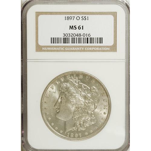 <B>1897-O S$1 MS61 NGC.</B></I> Fully lustrous with a light golden cast across both sides, this piece is well struck, with nary a trace of striking softness above Liberty's ear, nor on the eagle's breast feathers. Faint repunching is noted on the bases of 1 and 7 in the date. A seemingly typical number of minor blemishes limit the grade, but Liberty's cheek is unmarked.<BR><BR><b>Shipping:</b> Coins & Currency (<a target="_blank" href="http://www.heritageauctions.com/common/shipping.php">view shipping information</a>)