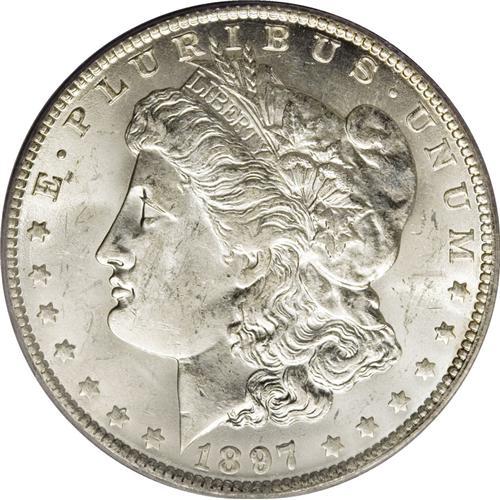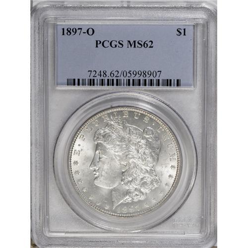 <B>1897-O S$1 MS62 PCGS.</B></I> Both sides of this pleasing Mint State example have brilliant and frosty silver luster. A few light surface marks are expected at the grade, but none are significant. The strike is typical of this issue and most other New Orleans Mint dates with weakness over Liberty's ear and on the eagle's breast feathers. This date is scarce in all Mint State grades, and seldom seen any finer than this piece.<BR><BR><b>Shipping:</b> Coin/Currency (<a target="_blank" href="http://www.heritageauctions.com/common/shipping.php">view shipping information</a>)