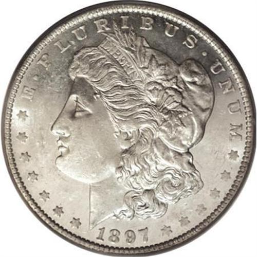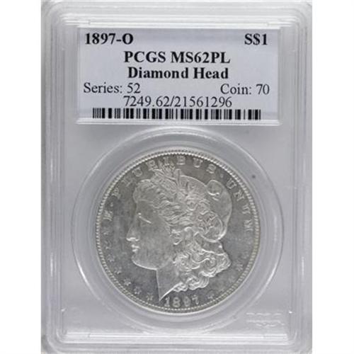 <B>1897-O S$1 MS62 Prooflike PCGS.</B></I> Ex: Diamond Head. An essentially brilliant example that has a clean reverse and a moderately abraded obverse. The eagle's breast and the hair above the ear are slightly soft, as usual for the issue. The 1897-O is a better date in any Mint State grade, but prooflike pieces are formidable rarities. PCGS has certified only 12 pieces as Prooflike, and 10 as DMPL. Population: 5 in 62 Prooflike, 4 finer (6/07).<BR><I>From the Diamond Head Registry Set of Prooflike Dollars.</B></I><BR><BR><B>Coin Engraver:</B> George T. Morgan<BR><BR><b>Shipping:</b> Coins & Currency (<a target="_blank" href="http://www.heritageauctions.com/common/shipping.php">view shipping information</a>)