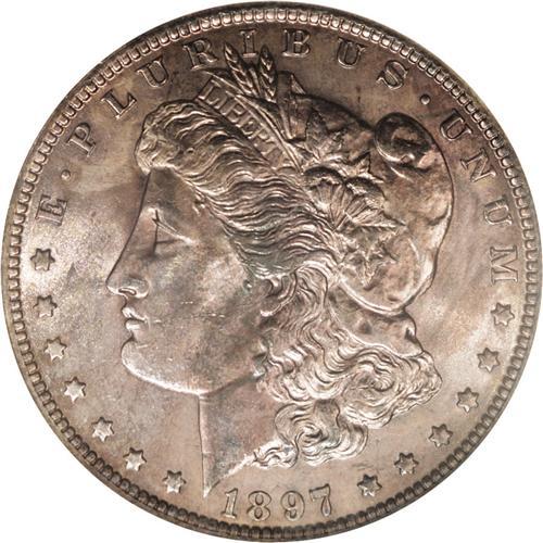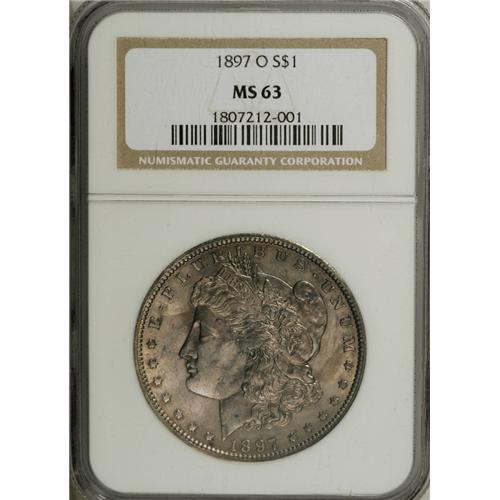 <B>1897-O S$1 MS63 NGC.</B></I> Full frosty luster is visible beneath lilac-gold and steel toning on both sides of this scarce Morgan silver dollar. This is another New Orleans Mint date that actually saw use in commerce, rather than storage at the Treasury. Today, most examples are worn with few surviving Mint State pieces.<BR><BR><b>Shipping:</b> Coins & Currency (<a target="_blank" href="http://www.heritageauctions.com/common/shipping.php">view shipping information</a>)