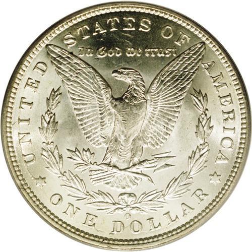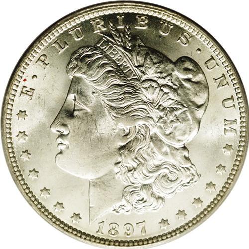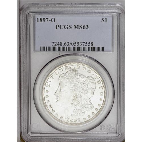 <B>1897-O<img border='0' src='http://www.heritagecoins.com/images/star.gif' width=10 height=10>$1> MS63 PCGS.</B></I> A conditionally scarce, late date Morgan that is remarkably difficult in Uncirculated grades. This piece displays steely, satin-like surfaces and is minimally abraded for an MS63. A bit softly struck in the centers, as usual, and brilliant throughout.