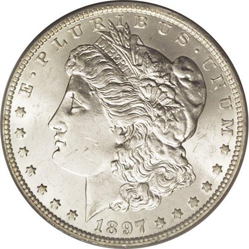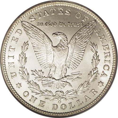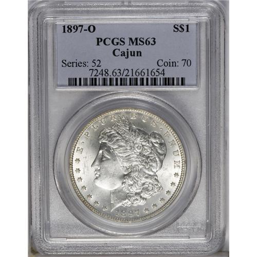 <B>1897-O<img border='0' src='http://www.heritagecoins.com/images/star.gif' width=10 height=10>$1> MS63 PCGS.</B></I> Ex: Cajun Collection. An excellent strike, considering it is a late New Orleans Mint dollar. There is good detail to the breast feathers, and a reasonable amount of the detail above the ear is also present. The fields are silver-white, and show abundant cartwheel luster for this often lackluster issue.<BR><I>From The Chicago-Ark Collection.</B></I>