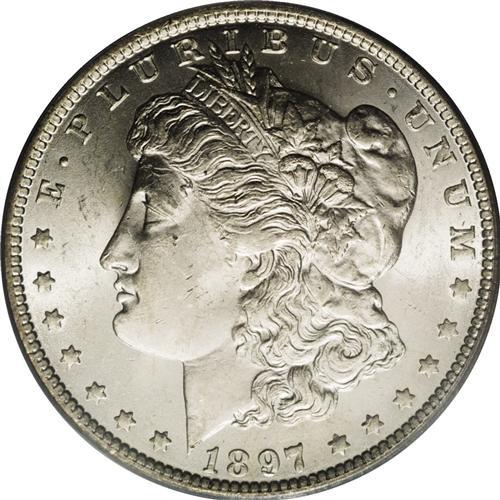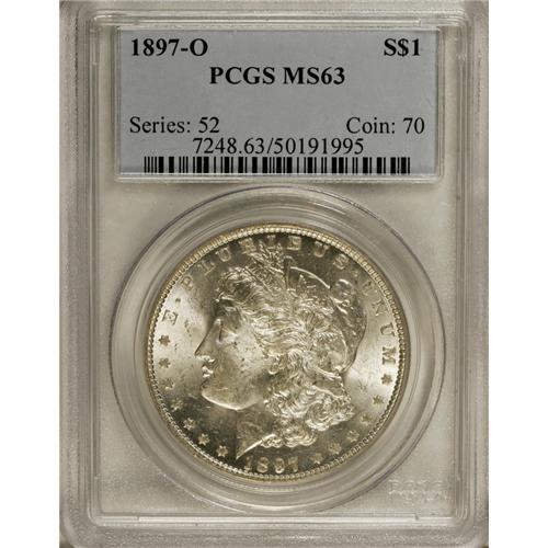 <B>1897-O S$1 MS63 PCGS.</B></I> Mint State 1897-O dollars are somewhat scarce in comparison to later New Orleans Mint dollars. Most are poorly struck with unsatisfactory luster. The current MS63 coin displays a better-than-average strike, though softness in the hair over Liberty's ear is noted. Untoned surfaces exhibit bright luster and a few minute grade-defining marks.<BR><BR><b>Shipping:</b> Coin/Currency (<a target="_blank" href="http://www.heritageauctions.com/common/shipping.php">view shipping information</a>)