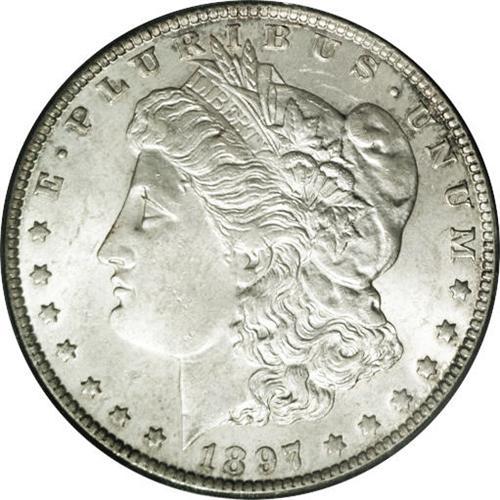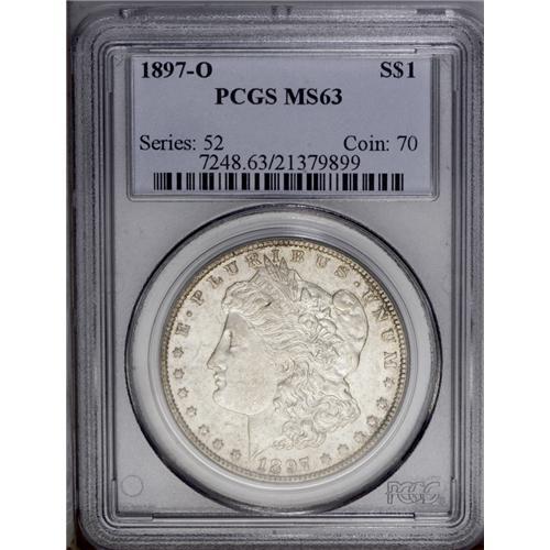 <B>1897-O<img border='0' src='http://www.heritagecoins.com/images/star.gif' width=10 height=10>$1 MS63 PCGS.</B></I> The luster is somewhat subdued (especially on the obverse) as often seen on this issue, but the strike is well executed. Mentionable abrasions are few. There are hints of smoke-gray and amber toning on both sides of this mostly untoned coin. Wispy die cracks connect many of the reverse letter tops. This coin is much superior to the "typical" 1897-O encountered in the marketplace, and is high-end for the grade. PCGS has graded 39 examples finer (1/06).<BR><I>From The Leslie E. Lunsford Collection, #7 Current Finest Registry Morgan Dollars Basic Set, Circulation Strikes.</B></I>