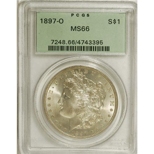<B>1897-O S$1 MS66 PCGS.</B></I> This piece is housed in an older green-label holder and exhibits light gold toning over satiny silver surfaces. It is sharply struck and highly appealing. Here is another date that is conditionally rare; the '97-O is common enough in circulated grades, rare in Mint State grades, and extremely rare in Gem or finer, although such pieces do exist, as illustrated here. Gems are typically boldly struck with exceptional mint luster.<BR> Total production for this issue exceeded 4 million coins from 22 die pairs that were sent from Philadelphia to New Orleans, according to official records. It is possible that some additional reverse dies remained from 1896. If the entire production resulted from those 22 die pairs, the typical below-average appearance of strike is easily explained. Just seven varieties were recorded in VAM, all of a minor nature.<BR> In <I>The Official Red Book of Morgan Silver Dollars,</B></I> Dave Bowers noted: "The 1897-O is a cherrypicker's dream. Most are poorly or lightly struck, and on most the luster is below par as well. However, there are exceptions. While others buy certified coins of blah quality, you can track down a nice one, say hand-picked MS63. A Choice MS64 or a Gem MS65 is expensive, and not easily ordered just anywhere!" Bowers continued on this theme: "Strike ranges from poor to below average, not a good sign, but enough sharp pieces exist that with searching one can be found. The luster on the 1897-O usually is dull and lifeless, mounting a challenge to be combined with searching for a sharp strike." Alternatively, the connoisseur can easily acquire this coin when it crosses the auction block, and eliminate any need for a long search. Certified in a green-label holder. Population: 5 in 66, 2 finer (2/07).<BR><I>From The Jackson Hole Collection.</B></I><BR><BR><b>Shipping:</b> Coins & Currency (<a target="_blank" href="http://www.heritageauctions.com/common/shipping.php">view shipping information</a>)