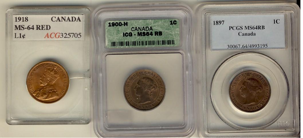 1897 PCGS & 1900H ICG 1¢ MS64RB along with 1918 ACG MS64RD. Lot of 3 certified coins.