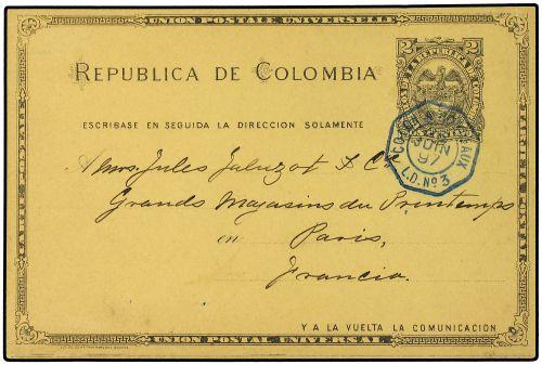 1897 Postal stationary envelope 2 centavos grey written from SANTANDER with BARRANQUILLA transit on reverse and stationary cancelled by octagonal French paquebot COLON A BORDEAUX L.D. No 3 datestamp in blue (Salles 1478) addressed to FRANCE. Very fine item.