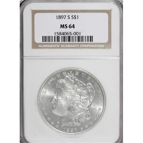 <B>1897-S $1 MS64 NGC.</B></I> . NGC Census: (1789/732). PCGS Population (2440/1176). Mintage: 5,825,000. Numismedia Wsl. Price for NGC/PCGS coin in MS64: $144. (#7250)<BR><BR><B>Coin Engraver:</B> George T. Morgan<BR><BR><b>Shipping:</b> Coins & Currency (<a target="_blank" href="http://www.heritageauctions.com/common/shipping.php">view shipping information</a>)