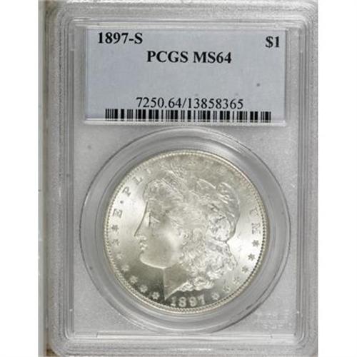 <B>1897-S $1 MS64 PCGS.</B></I> . PCGS Population (2440/1176). NGC Census: (1789/732). Mintage: 5,825,000. Numismedia Wsl. Price for NGC/PCGS coin in MS64: $144. (#7250)<BR><BR><B>Coin Engraver:</B> George T. Morgan<BR><BR><b>Shipping:</b> Coins & Currency (<a target="_blank" href="http://www.heritageauctions.com/common/shipping.php">view shipping information</a>)