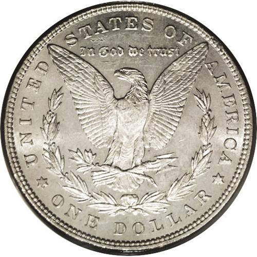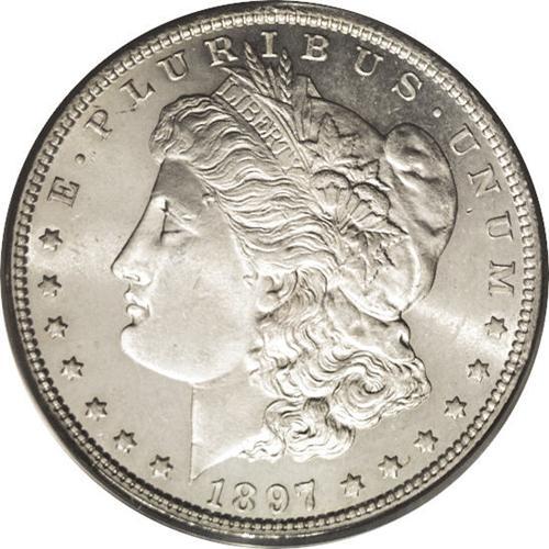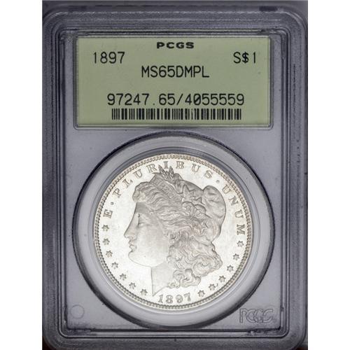 <B>1897<img border='0' src='http://www.heritagecoins.com/images/star.gif' width=10 height=10>$1> MS65 Deep Mirror Prooflike PCGS.</B></I> Deeply mirrored fields offer a moderate contrast with the sharply struck devices. A few whispers of color barely keep this flashy Morgan from designation as a "white" coin. The surfaces are lovingly preserved. Population: 22 in 65, 2 finer (4/06).