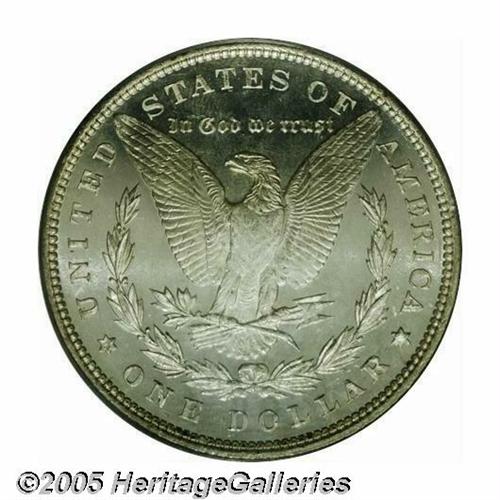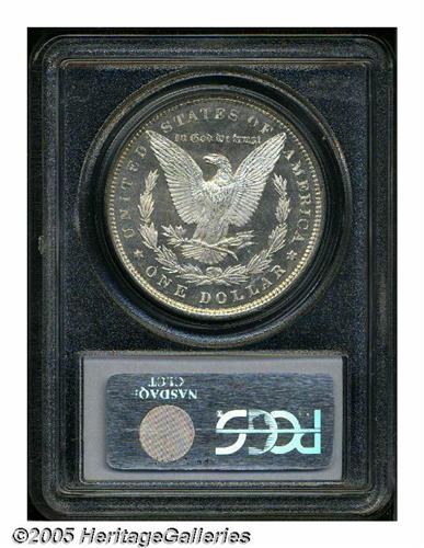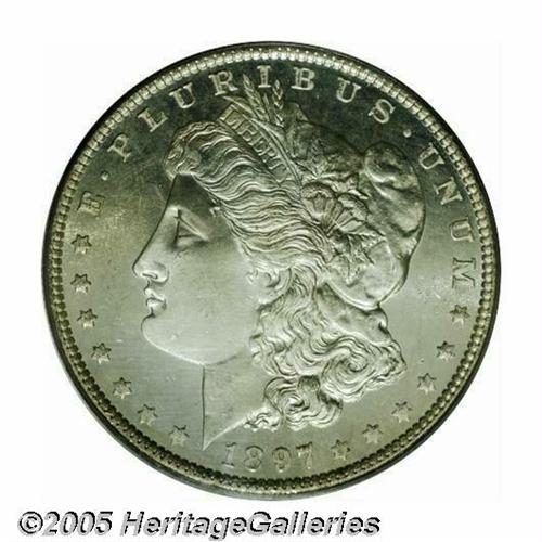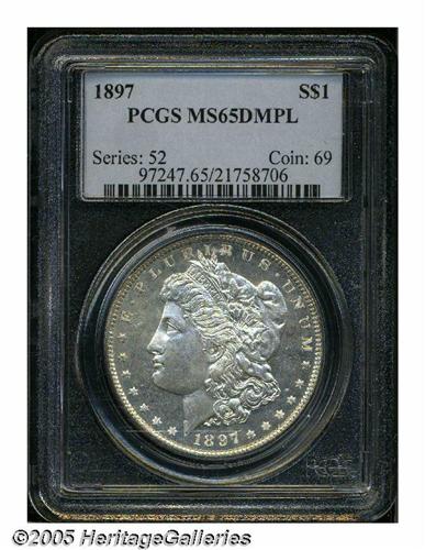 <B>1897<S$1> MS65 Deep Mirror Prooflike PCGS.</B></I> Deeply mirrored fields offer a moderate contrast with the sharply struck, lightly frosted devices. A few whispers of golden color on the left side of the obverse barely keep this flashy Morgan from designation as a "white" coin. The surfaces are lovingly preserved. Population: 22 in 65 DMPL, 2 finer (3/05).