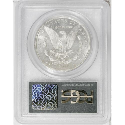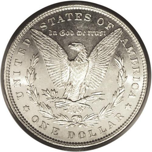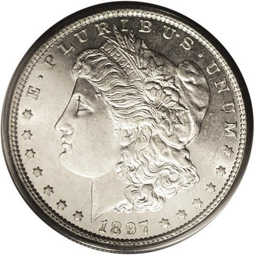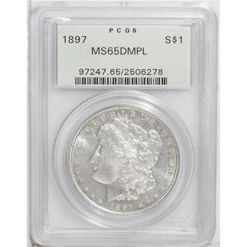 <B>1897<img border='0' src='http://www.heritagecoins.com/images/star.gif' width=10 height=10>$1> MS65 Deep Mirror Prooflike PCGS.</B></I> The 1897 is an available coin as a non-prooflike, but Prooflike and especially Deep Mirror Prooflike coins are decidedly scarce. Only 22 Gems have been certified by PCGS with two pieces finer (8/06). This is an attractive coin that is brilliant throughout. The fields have a confirmed deep reflectivity and there is a moderate amount of satiny mint luster over the devices. Fully struck.