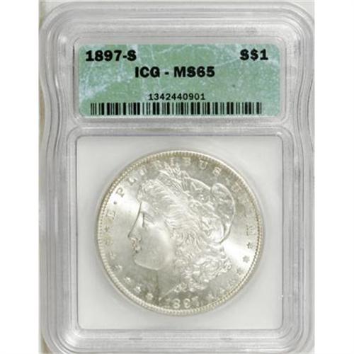 <B>1897-S $1 MS65 ICG.</B></I> . NGC Census: (615/117). PCGS Population (958/218). Mintage: 5,825,000. Numismedia Wsl. Price for NGC/PCGS coin in MS65: $500. (#7250)<BR><BR><B>Coin Engraver:</B> George T. Morgan<BR><BR><b>Shipping:</b> Coins & Currency (<a target="_blank" href="http://www.heritageauctions.com/common/shipping.php">view shipping information</a>)