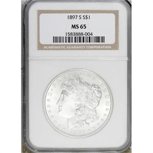 <B>1897-S $1 MS65 NGC.</B></I> NGC Census: (614/116). PCGS Population (949/218). Mintage: 5,825,000. Numismedia Wsl. Price for NGC/PCGS coin in MS65: $500. (#7250)<BR><BR><B>Coin Engraver:</B> George T. Morgan<BR><BR><b>Shipping:</b> Coins & Currency (<a target="_blank" href="http://www.heritageauctions.com/common/shipping.php">view shipping information</a>)