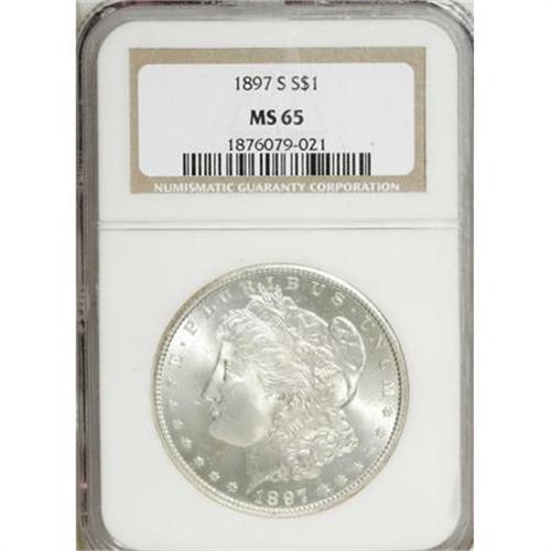 <B>1897-S $1 MS65 NGC.</B></I> . NGC Census: (615/117). PCGS Population (958/218). Mintage: 5,825,000. Numismedia Wsl. Price for NGC/PCGS coin in MS65: $500. (#7250)<BR><BR><B>Coin Engraver:</B> George T. Morgan<BR><BR><b>Shipping:</b> Coins & Currency (<a target="_blank" href="http://www.heritageauctions.com/common/shipping.php">view shipping information</a>)