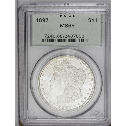 <B>1897<img border='0' src='http://www.heritagecoins.com/images/star.gif' width=10 height=10>$1> MS65 PCGS.</B></I> Virtually untoned with the expected sharpness of this lesser-seen Philadelphia issue and shimmering, satiny luster. Housed in an earlier PCGS holder with a green label.