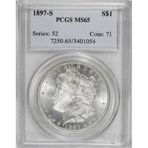 <B>1897-S $1 MS65 PCGS.</B></I> PCGS Population (937/217). NGC Census: (611/117). Mintage: 5,825,000. Numismedia Wsl. Price for NGC/PCGS coin in MS65: $500. (#7250)<BR><BR><B>Coin Engraver:</B> George T. Morgan<BR><BR><b>Shipping:</b> Coins & Currency (<a target="_blank" href="http://www.heritageauctions.com/common/shipping.php">view shipping information</a>)