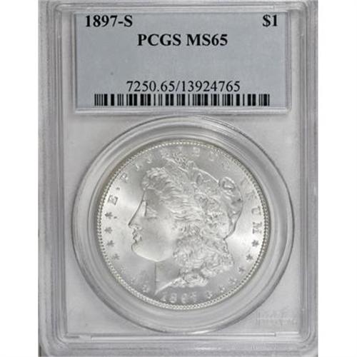 <B>1897-S $1 MS65 PCGS.</B></I> PCGS Population (947/218). NGC Census: (613/116). Mintage: 5,825,000. Numismedia Wsl. Price for NGC/PCGS coin in MS65: $500. (#7250)<BR><BR><B>Coin Engraver:</B> George T. Morgan<BR><BR><b>Shipping:</b> Coins & Currency (<a target="_blank" href="http://www.heritageauctions.com/common/shipping.php">view shipping information</a>)