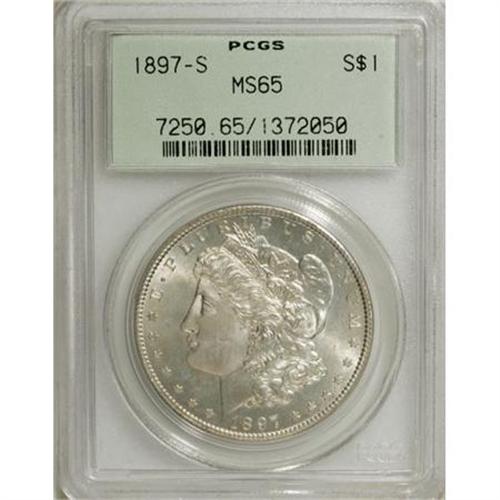 <B>1897-S $1 MS65 PCGS.</B></I> PCGS Population (959/218). NGC Census: (615/117). Mintage: 5,825,000. Numismedia Wsl. Price for NGC/PCGS coin in MS65: $500. (#7250)<BR><BR><B>Coin Engraver:</B> George T. Morgan<BR><BR><b>Shipping:</b> Coins & Currency (<a target="_blank" href="http://www.heritageauctions.com/common/shipping.php">view shipping information</a>)