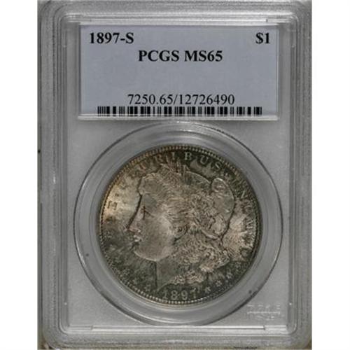 <B>1897-S $1 MS65 PCGS.</B></I> PCGS Population (962/219). NGC Census: (619/117). Mintage: 5,825,000. Numismedia Wsl. Price for NGC/PCGS coin in MS65: $500. (#7250)<BR><BR><B>Coin Engraver:</B> George T. Morgan<BR><BR><b>Shipping:</b> Coins & Currency (<a target="_blank" href="http://www.heritageauctions.com/common/shipping.php">view shipping information</a>)