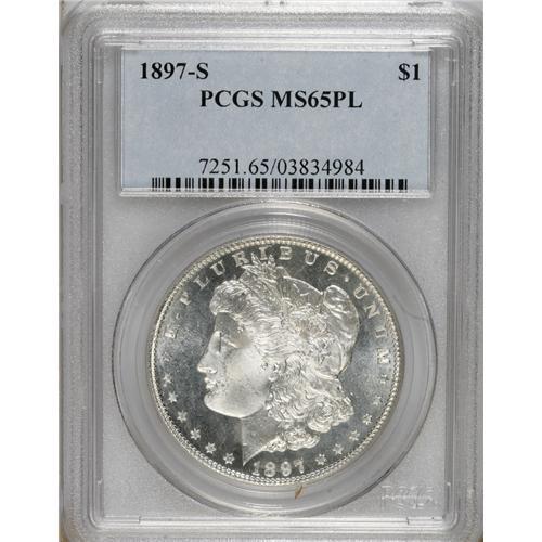 <B>1897-S $1 MS65 Prooflike PCGS.</B></I> PCGS Population (124/0). NGC Census: (97/17). Numismedia Wsl. Price for NGC/PCGS coin in MS65: $620. (#7251)<BR><BR><b>Shipping:</b> Coins & Currency (<a target="_blank" href="http://www.heritageauctions.com/common/shipping.php">view shipping information</a>)