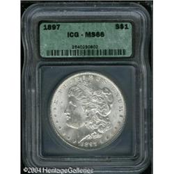 1897 S$1 MS66 ICG. An essentially brilliant Morgan <B>1897 S$1 MS66 ICG.</B></I> An essentially brilliant Morgan Dollar that has a good strike, pleasing luster, and well preserved fields. <BR><BR><B>Important notice:</B> Heritage usually auctions material at the rate of 200-250 lots per hour. On some occasions eBay Live bid software or the Internet may not be able to keep up with the pace of the auction. We recommend placing a realistic absentee bid now as insurance to avoid disappointment. Occasionally the auctioneer may eliminate or reject an eBay Live bid, and the auctioneer may also reopen a lot after the close of the eBay live bidding (usually because we missed an audience bid), and may reject your bid even if it shows you as the winning bidder. By bidding via eBay Live, you agree that Heritage may award the lot to another bidder at its sole discretion under the circumstances described above or any other reasonable circumstances. Since eBay bids are not shown to us until we open the lot on the floor, we treat those bids just like floor bids. In most cases the floor responds before the eBay bid is presented to us, due to Internet lag time, so for consistency we have made it a policy that floor bids are always considered first over tie eBay live bids. Also please note that all Heritage lots purchased through eBay Live carry a 20% Buyer's Premium. Please make sure you read the Terms and Conditions before you bid. This lot is being auctioned in conjunction with a live floor auction by Heritage Galleries & Auctioneers. All final auction and invoice information will be supplied by Heritage Galleries & Auctioneers, and all other information should be considered preliminary. Lot:7687