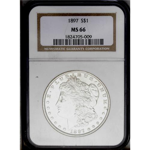 <B>1897<img border='0' src='http://www.heritagecoins.com/images/star.gif' width=10 height=10>$1> MS66 NGC.</B></I> Frosty luster endows silver-gray surfaces that exhibit adequately impressed design features. A few minute marks on the cheek and neck and in the left obverse field are mentioned for accuracy. A mere eight examples have been graded finer by NGC (3/06). <BR><BR><B>Important notice:</B> Heritage usually auctions material at the rate of 200-250 lots per hour. On some occasions eBay Live bid software or the Internet may not be able to keep up with the pace of the auction. We recommend placing a realistic absentee bid now as insurance to avoid disappointment. Occasionally the auctioneer may eliminate or reject an eBay Live bid, and the auctioneer may also reopen a lot after the close of the eBay live bidding (usually because we missed an audience bid), and may reject your bid even if it shows you as the winning bidder. By bidding via eBay Live, you agree that Heritage may award the lot to another bidder at its sole discretion under the circumstances described above or any other reasonable circumstances. Since eBay bids are not shown to us until we open the lot on the floor, we treat those bids just like floor bids. In most cases the floor responds before the eBay bid is presented to us, due to Internet lag time, so for consistency we have made it a policy that floor bids are always considered first over tie eBay live bids. Also please note that all Heritage lots purchased through eBay Live carry a 20% Buyer's Premium. Please make sure you read the Terms and Conditions before you bid. This lot is being auctioned in conjunction with a live floor auction by Heritage Galleries & Auctioneers. All final auction and invoice information will be supplied by Heritage Galleries & Auctioneers, and all other information should be considered preliminary. Lot:3707 <BR><BR><B>Winning Notification and Billing:</B> After the FINAL session in this auction is complete, Heritage will send e-mail and snail mail invoices. This process normally takes several days. All final auction and invoice information will be supplied by Heritage Galleries & Auctioneers, and all other information should be considered preliminary. <BR><BR>This auction will be conducted on a live auction floor and over the Internet through eBay Live. If you choose to place an absentee bid, please take a moment to <font color='#0000ff'><u><a href='http://pages.ebay.com/liveauctions/help/before/laabsentee.html'>learn how eBay Live absentee bidding works</a></u></font><font color='#000000'>