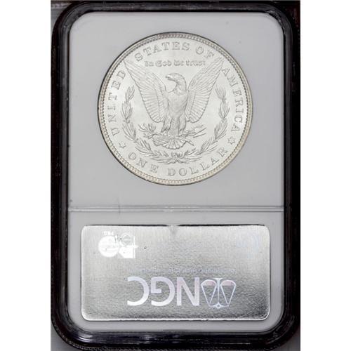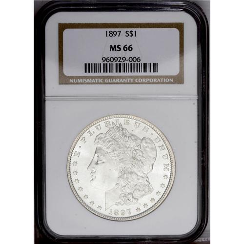 <B>1897<img border='0' src='http://www.heritagecoins.com/images/star.gif' width=10 height=10>$1> MS66 NGC.</B></I> Looking like a textbook example of a Brilliant Uncirculated Morgan dollar, this splendid piece displays a full strike and exquisitely preserved surfaces that approach immaculate preservation. A bright, dazzling, beautiful Premium Gem. Rather scarce at this grade level. Census: 115 in 66, 8 finer (1/06).