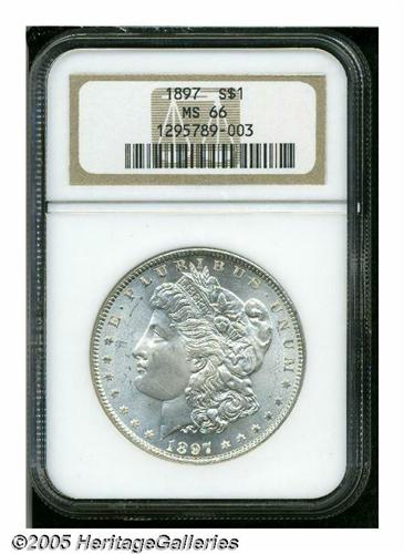 <B>1897<S$1> MS66 NGC.</B></I> The dusky gold patina does not obscure the beauty of this well struck and lustrous Gem. Impressively preserved and with outstanding eye appeal. A singular roller-like mark is visible on Liberty's cheek. Population: 97 in 66, 8 finer (5/05).