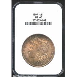 1897 S$1 MS66 NGC. This lovely and original Gem is lustrous despite its deep rust-orange and green-gray patina. Well preserved, and somewhat underappreciated for a Morgan Dollar issue. Less than 3 million pieces were struck, and although Uncirculated examples are not rare, they become elusive at the MS66 level. Population: 58 in 66, 4 finer (7/02). Important notice: We expect to be auctioning lots at the rate of 200-250 per hour. Sometimes eBay Premier live bid software cannot keep up with that pace, so we strongly recommend that you place a realistic proxy bid now as insurance to avoid disappointment. Also please note that all Heritage/CAA lots purchased through eBay Premier carry a 20% Buyer's Premium. Please make sure you read the Terms and Conditions.