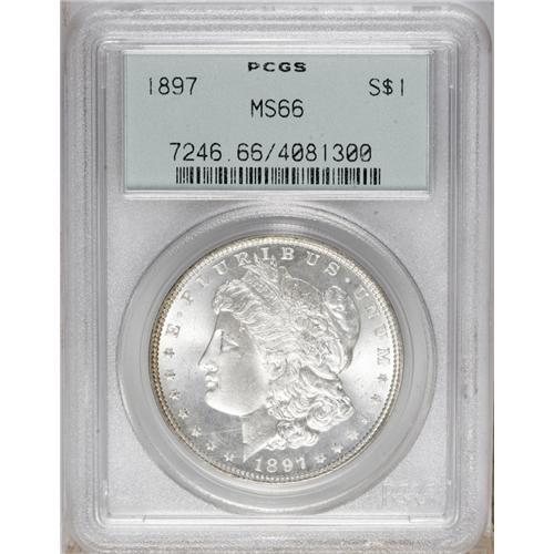 <B>1897<img border='0' src='http://www.heritagecoins.com/images/star.gif' width=10 height=10>$1> MS66 PCGS.</B></I> Both sides are nicely struck with pleasing luster, and traces of mint frost appear on the reverse devices. Largely untoned and housed in a green label holder.