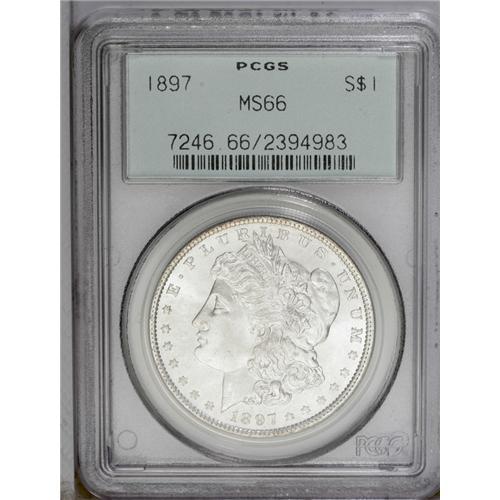 <B>1897<img border='0' src='http://www.heritagecoins.com/images/star.gif' width=10 height=10>$1> MS66 PCGS.</B></I> Far above average in appearance, with snow-white surfaces, brilliant cartwheel luster, and a noteworthy lack of abrasions. Certified in a green label holder. <BR><BR><B>Important notice:</B> Heritage usually auctions material at the rate of 200-250 lots per hour. On some occasions eBay Live bid software or the Internet may not be able to keep up with the pace of the auction. We recommend placing a realistic absentee bid now as insurance to avoid disappointment. Occasionally the auctioneer may eliminate or reject an eBay Live bid, and the auctioneer may also reopen a lot after the close of the eBay live bidding (usually because we missed an audience bid), and may reject your bid even if it shows you as the winning bidder. By bidding via eBay Live, you agree that Heritage may award the lot to another bidder at its sole discretion under the circumstances described above or any other reasonable circumstances. Since eBay bids are not shown to us until we open the lot on the floor, we treat those bids just like floor bids. In most cases the floor responds before the eBay bid is presented to us, due to Internet lag time, so for consistency we have made it a policy that floor bids are always considered first over tie eBay live bids. Also please note that all Heritage lots purchased through eBay Live carry a 20% Buyer's Premium. Please make sure you read the Terms and Conditions before you bid. This lot is being auctioned in conjunction with a live floor auction by Heritage Galleries & Auctioneers. All final auction and invoice information will be supplied by Heritage Galleries & Auctioneers, and all other information should be considered preliminary. Lot:3706 <BR><BR><B>Winning Notification and Billing:</B> After the FINAL session in this auction is complete, Heritage will send e-mail and snail mail invoices. This process normally takes several days. All final auction and invoice information will be supplied by Heritage Galleries & Auctioneers, and all other information should be considered preliminary. <BR><BR>This auction will be conducted on a live auction floor and over the Internet through eBay Live. If you choose to place an absentee bid, please take a moment to <font color='#0000ff'><u><a href='http://pages.ebay.com/liveauctions/help/before/laabsentee.html'>learn how eBay Live absentee bidding works</a></u></font><font color='#000000'>