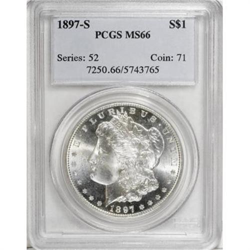 <B>1897-S $1 MS66 PCGS.</B></I> This is a visually stunning Premium Gem that combines utterly brilliant, snow-white surfaces with effulgent, coruscating mint frost and great surface preservation. A few trivial marks become evident under magnification, but none of them are distracting. An outstanding example of this popular issue from the San Francisco Mint. <BR><BR><B>Coin Engraver:</B> George T. Morgan<BR><BR><b>Shipping:</b> Coins & Currency (<a target="_blank" href="http://www.heritageauctions.com/common/shipping.php">view shipping information</a>)