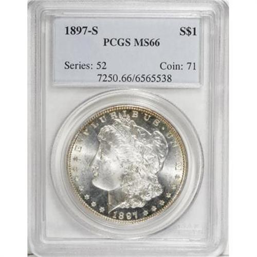 <B>1897-S $1 MS66 PCGS.</B></I> A remarkably frosty silver dollar with booming cartwheel luster and just a bit of peripheral toning on the otherwise brilliant-white surfaces. Well struck and remarkably preserved, with a few minute marks in the reverse fields. <BR><BR><B>Coin Engraver:</B> George T. Morgan<BR><BR><b>Shipping:</b> Coins & Currency (<a target="_blank" href="http://www.heritageauctions.com/common/shipping.php">view shipping information</a>)