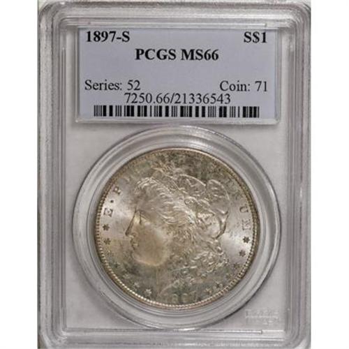 <B>1897-S $1 MS66 PCGS.</B></I> Rich rose-gold and cloud-gray patina drapes both sides of this strongly lustrous Premium Gem. Well-defined for the issue with solid eye appeal. A few light roller marks are evident on the portrait. PCGS has graded 22 finer examples (1/08).<BR><I>From The Jimmy G. PCGS Registry Collection of Morgan Dollars with Varieties.</B></I><BR><BR><B>Coin Engraver:</B> George T. Morgan<BR><BR><b>Shipping:</b> Coins & Currency (<a target="_blank" href="http://www.heritageauctions.com/common/shipping.php">view shipping information</a>)