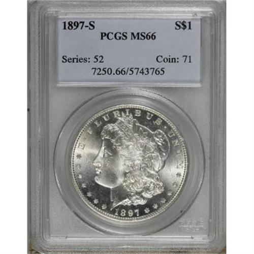 <B>1897-S $1 MS66 PCGS.</B></I> This is a visually stunning Premium Gem that combines utterly brilliant, snow-white surfaces with effulgent, coruscating mint frost and great surface preservation. A few trivial marks become evident under magnification, but none of them are distracting. An outstanding example of this popular issue from the San Francisco Mint. <BR><BR><B>Coin Engraver:</B> George T. Morgan<BR><BR><b>Shipping:</b> Coins & Currency (<a target="_blank" href="http://www.heritageauctions.com/common/shipping.php">view shipping information</a>)