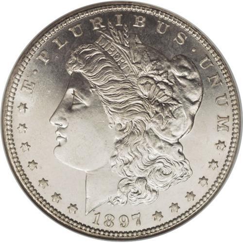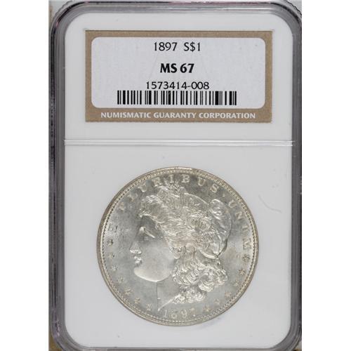 <B>1897 S$1 MS67 NGC.</B></I> NGC and PCGS have seen several thousand Uncirculated 1897 Morgans. The certified population begins to decrease slightly in MS65, and more so in MS66. MS67 coins are quite tough to come by, as evidenced by just 25 examples graded, and none finer (3/07). White, near-pristine surfaces are noted on both sides of the Superb Gem in this lot, and take on a partially prooflike appearance. The design features are well struck throughout.<BR><BR><b>Shipping:</b> Coins & Currency (<a target="_blank" href="http://www.heritageauctions.com/common/shipping.php">view shipping information</a>)